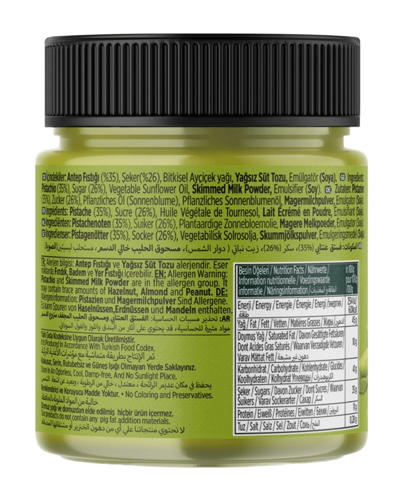 Gaziantep’in en kaliteli fıstıklarını kullanarak yeni ve modern üretim tesisimizde el değmeden hazırladık. %35 oranında gerçek Antep fıstığı içeriğiyle dengeli, yumuşak ve akışkan bir lezzet sunar.