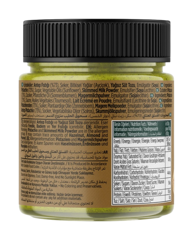 Gaziantep’in en kaliteli fıstıklarını kullanarak yeni ve modern üretim tesisimizde el değmeden hazırladık. %73 oranında Antep fıstığı içeriğiyle yoğun aroması, güçlü dokusu ve zengin tadı ilk kaşıkta farkını hissettirir.