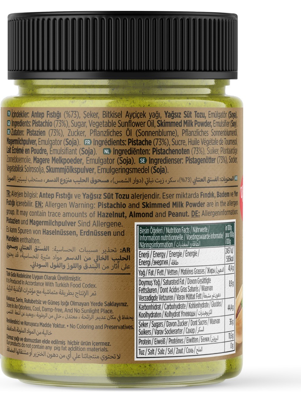 Gaziantep’in en kaliteli fıstıklarını kullanarak yeni ve modern üretim tesisimizde el değmeden hazırladık. %73 oranında Antep fıstığı içeriğiyle yoğun aroması, güçlü dokusu ve zengin tadı ilk kaşıkta farkını hissettirir.